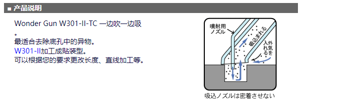 日本進(jìn)口W301-II-TC 一邊吹一邊吸適合去除底孔中的異物。W301-II加工成貼裝型??梢愿鶕?jù)您的要求更改長(zhǎng)度、直線加工等。