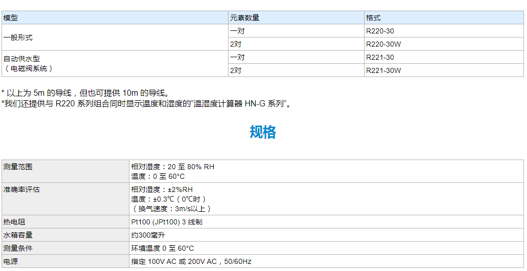 測量范圍 相對(duì)濕度:20 至 80% RH溫度:0 至 60°C準(zhǔn)確率評(píng)估 相對(duì)濕度:±2%RH溫度:±0.3℃(0℃時(shí))(換氣速度:3m/s以上)熱電阻 Pt100 (JPt100) 3 線制水箱容量 約300毫升測量條件 環(huán)境溫度 0 至 60°C電源 100V AC 或 200V AC,50/60Hz